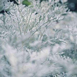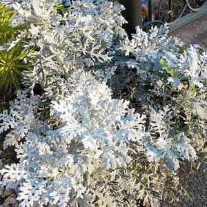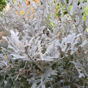 シロタエギクは 猛暑の中で 涼しげな 白い葉っぱですね。 秋には、黄色の花が 咲きます。 挿し木でどんどん 増えますよ。