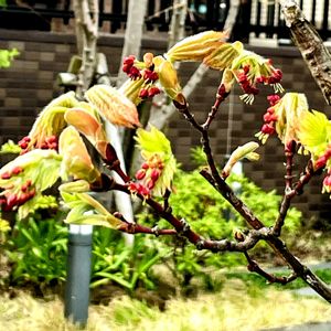 楓🍁の新芽 バス停側のマンションの 樹木🌳 🚌の待ち時間に 出勤途中で