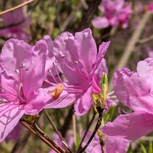 4月4日の紫金山公園のコバノミツバツツジ 急に満開になった。 他のツツジに先がけて咲く。葉は花の後に開くが、同時期に開くのもあるようです。 紫金山公園全体がピンクに染まるほど見事なのですが、見に来ている人はまばらです。 近年は桜の時期と重なるようです。 昨日の、観光バスを仕立てて来ている又兵衛桜の賑わいと比べると、不思議です。 コバノミツバツツジ ツツジ科 ツツジ属