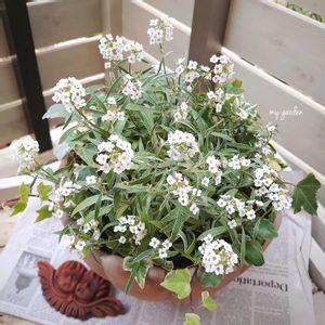 こんばんは♡•ᴗ•ꕤ*.゚ スーパーアリッサム アイシクルナイトさんꔛꕤ 昨年10月にお迎えして 8号鉢に植えています🪴 グリーンに白の斑入りの 葉っぱ🌿が可愛い💚🤍 お花も香って... 良く咲いています(⌯˃̶᷄ ⁻̫ ˂̶᷄⌯)♡ スーパーアリッサムさん♡ 推しのお花のひとつです➵❀⁎ .。
