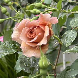 雨の朝です☔バラは、ぼちぼち開花 ①つるジュリア 特に先端ばかりに咲きがちなので、だいぶ意識して横向きの枝が多くなるようにしました。 いっぱい咲くといいな ②ブルームーンストーン バラ開花が遅い我が家ですが、これだけ良く咲いてます♪ (①②チェッカーズ繋がり🤣) ③彩(あや) まだ開花半ばですが、1番花は大きいです。こんなに綺麗なバラだっけ?って位、ハッとする美しさです。 ④エリザベス まだ蕾ですが、可愛い癒されピンクです🩷 昨年良く咲いてくれたので今年も期待しちゃう。 ⑤2週間くらい前にお迎えした新苗2鉢 手前でちょっと咲いたのが、こんぺいとう🍬 奥が、エトワールブラン どちらも麻記子さんのバラ🎶 こんぺいとうだけ、ちょっと咲かせてみちゃったけど、この後、蕾も全部とりました。 エトワールブランは咲かせないつもりです。 『バラ買わない』って言ってるのですが、これだけなら『買ってないの範疇』というユルい私😁 既存のバラが、ぼちぼち枯れてるしね。
