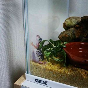 新しい家族です レオパードゲッコー(ヒョウモントカゲモドキ)マックスノー 名前をアルバと言います!! ええ、チラの品種からですよ(笑) 白いな…アルバ(Alba)でいいか!! ってな感じで( ͡ ͜ ͡ ) 反対側にはシダとか流木を置いてあってアルバさんのお昼寝スポットになっております アクアリウムバスはこの子を買いに行ったようなもの…!! これからよろしく〜😌