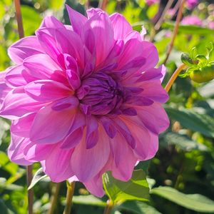 令和7年 ダリア祭-4 色彩の美しさ: 濃いピンク色のダリアが太陽の光を浴びて、花びらが透き通るように輝いて、背景の他の色の花々とのコントラストも鮮やかで、色彩が豊かです😊