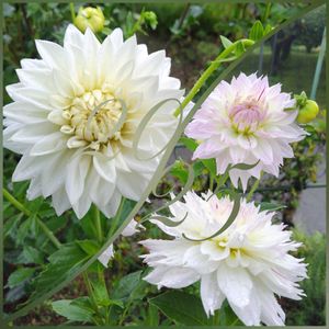 こんにちは😊 連投失礼します🙇💓 1枚め…今日のイチオシ、ダリア🤍✨ 名前は、“和がすり”💓 川西ダリア園からのニューフェイス💕 名前からもっと絣みたいな色かと想像してたら、白に微かに紫色が入っています⤴️⤴️ 2枚め…クジャクアスターいろいろ… 最初、一重の白🤍とピンク🩷だけでしたが、八重の紫💜、ピンク🩷、薄紫💜を何年か前に植えました😉👌 1番好きなのは薄紫💜✨ 3枚め…今日のフラワーアレンジ💓 秋の花、ダリアをメインに、秋明菊、コスモス、クジャクアスターも使って… 4枚め…フジバカマが年々大株になってます⤴️⤴️ 5枚め…バーバスカム🤍が、上まで咲いてきました⤴️⤴️ 🏷️お庭作り中