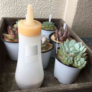 連投すみません🙏 この調味料ボトル、かなり年季入ってますが多肉ライフでの大事な小道具です。 私はこの中にオルトランを入れてあちこちにプシュー、ササーっと注入しています。 メリットは チャックの開け閉めが煩わしくない、 思い立ったらすぐ注入(撒く)できる、 水さえ入らなければ年中このままでも湿気らない、 何と言っても臭いが気にならない!! デメリットは たまーにドバッと出る😅(押しすぎ) たまーに詰まる🤣(顆粒の向きによる) キャップのオレンジ色が気に入らない😫(目立たない色があったらそっちがいい) ダイソーさんのおかげでオルトラン散布が苦痛ではなくなりました😘