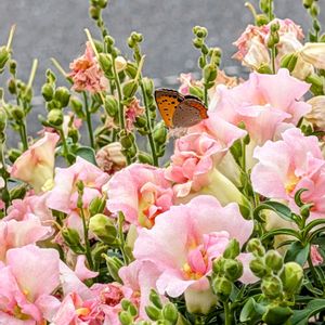 病院の花壇シリーズ❣️ ふんわりふわふわのキンギョソウ🩷💛 小さな蝶々がお食事中🦋