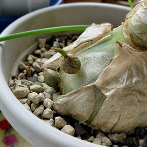 この不思議な植物は何かわかりませんか? この丸い球根みたいな下には 丸い球みたいなのがありました。