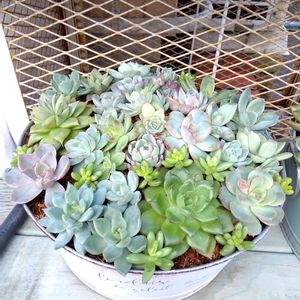 こちらも鉢減らし作戦です うちで2、3年生きて栄養分足りずにギリギリの ところで生きててその上去年の猛暑で ノックアウトしてしまった多肉達を集めてみました 真ん中あたり大切にしていたマリアや 大きくなれない七福美尼 左端には茎立ちして可愛さ失った ティンカーベルがいます