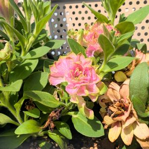 植え付け時に折ってしまって半分になっちゃった ゲブラさんの秋植えペチュニア スタウト😅 最近の秋晴れでお花を咲かせてくれました🩷💚 5号のスリット鉢で冬越しに挑戦デス😊