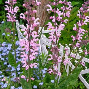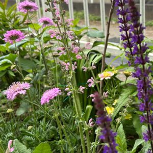 名前不明な子🥴を もう一回アップします😅 センターに立っている ギザギザ細長い葉っぱと のびのび茎に2段ピンクの花 どなたか🙋🏻♀️知ってますか? ┏○)) ペコリ💦 名前を判明できました❇️ サルビア プラテンシス です @まゆっちさん🕊 ありがとうございました💖