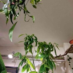 間もなく天井に届きそうな勢いの『イランイラン』 本当は超夏型なのでベランダに出したいのに諸事情により出せません。 とりあえず成長はしてくれてるものの、花芽が付かない⁉️😱 やっぱり、育成LEDじゃ光量足りないか…………😓💦💦
