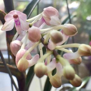 バンダ クリステンソニアナム Vanda christensonianum (旧 アスコケントルム属) 上の方の房になってるピンクのお花。 綻びかけてます😆💕 陽に透けて細胞がキラキラしてる✨ 草姿は魚のホネホネみたいなんですがお花が可憐でキュート。 夏はベランダでブラブラさせていて、冬は窓辺でブラブラ組です。 昨日ヤフオクでも見かけたわ。