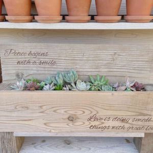 ステンシルやってみました😆 初めてにしては、まぁまぁ気に入ってます👌 大急ぎで廃材プランターも作りました😬 多肉さんもかき集めたのを放り込みました🤭 多肉植物は勝手に可愛くなるから大丈夫🎶 ⬆️平和は微笑みから始まります ↘️愛とは、大きな愛情を持って 小さなことをすることです。 マザーテレサ