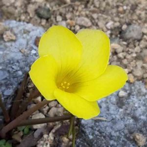これもオキザリス? 葉っぱが見当たらない👀💦 ブロックのすき間から一輪だけ😅
