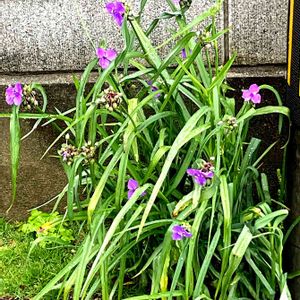 ど根性シリーズ 出勤途中に、小川の側の 電信柱の側に、ムラサキツユクサのお花が咲いていました。