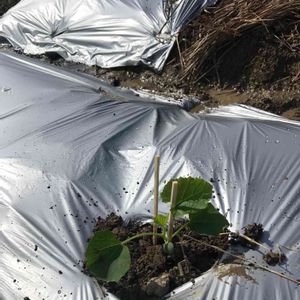 マクワウリの一種、網干メロンを定植しました。 このあと、保護用のビニールあんどんを設置して、シルバーマルチの上に敷きわら予定です。