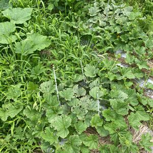 去年失敗した網干メロン。うどん粉病予防にサンボルドーを散布しました。