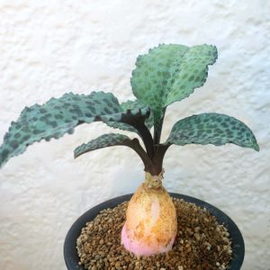 ドリミオプシスのキキアエ。 豹柄というか、チーター柄🐆 塊根部分がピンクでかわいい🩷 冬には葉が落ちちゃうので、もうすぐこの葉もおしまい。 622の無機で1ヶ月経たずに、スリットから根が出てる👀 葉裏はブラックでかっこいい🐦⬛