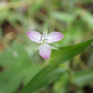イボクサ 水田の雑草、嫌がられている雑草なんですね。 汁をつけると、イボが取れるから、そう名前がついたとか。でも、実際は、そうでもないらしいです。 花は、淡い紫色。三枚の花弁で、雄しべが3つ、仮雄しべが3つ。 一日たつと、しぼむそうです。 (①) 葉は、互生で、節ごとに、葉がつきます。(②) 茎は横にはい、枝分かれします。葉の形は、細い楕円形で、先がとがっていました。(③) 葉の基部がさや状になっていて、茎を抱いていました。茎の片側だけ、毛がありました。(④) お百姓さんたちには、嫌われものの雑草、でも、見つけると、この可愛らしさと美しさに魅了されてしまいます。 9.16