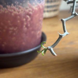 雨の止み間に庭パト。 サボテンは風除室に取り込んだけど、水が好きな多肉は軒下に出しっぱなし。 午後から大雨予報が出ています☔ デカリア マダガスカリエンシス(ジグザグの木)に小さな葉が出てました🌿 ジグザグが面白いけど、トゲは痛い😅 環境に馴染んだら丈夫で成長も早い。 下垂するのでこれからどうしようかと、皆さんの投稿を参考にさせていただいてます😀