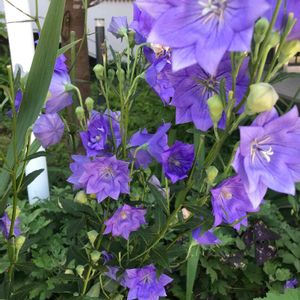 八重咲きのキキョウ いつも通る畑の傍らで横一列になって咲いてた😃 清楚で華やか✨ 後ろに立つ木々の木洩れ日がよく似合う😊💕