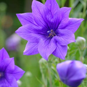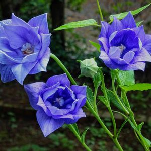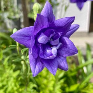 八重咲きキキョウ(桔梗) 古くから日本人に愛されている日本のお花です。 万葉集や、家紋にも使われてます。 近年、個体数減少で、野生の品種は、絶滅危惧種に指定されています。 園芸品種は、多くの品種が出回って、色は、紫、青、ピンク、白、斑入りなどまであります。 一重、八重咲きと、色々な品種が出て、日本のお庭を、更に楽しませてくれるキキョウです。