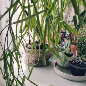 窓辺です いちばん左の、 リプサリス ピンクサリー 新芽がピンク💗らしいから 1年半前にメルカリで10㌢のカット苗購入して ここまでになったけど ピンク全然出てこない😶🌫️ おまけにカイガラムシついちゃって カイガラチェック🔍が日課です