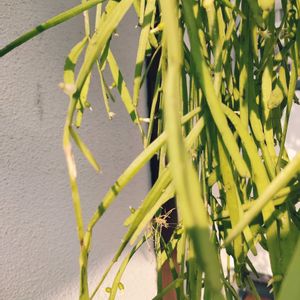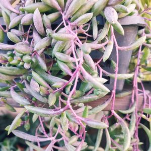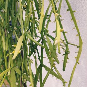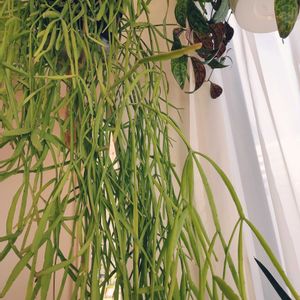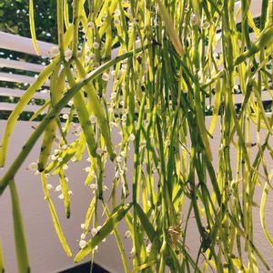 ④Rhipsalis pinksaree リプサリス ピンクサリー サボテン科 リプサリス属Rhipsalis ■タイプ 半耐寒性常緑多年草 サボテン科リプサリス属 ■耐寒性 弱め7℃くらい 冬場寒冷地では室内に取り込む ■置き場 直射日光の当たらない風通しの良いところ ■水やり 土が乾いてから やや乾かし気味に うちは2階のベランダ日陰で育てていて 夏でも毎週土曜日又は金曜日の夜ベランダで洗濯竿に吊るしてたっぷり水やり🚿 水肥料もあげている 水やり忘れても枯れないけど たまに葉先が黒くなる 買った時は葉先がピンクでしたが 夏は緑 新芽がピンクになる予定だけど なかなかならない どうしたらピンクになるんだろうか でも可愛いからいいか? 知ってるかた 是非教えて欲しいです