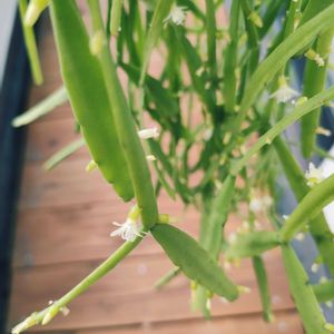 汚部屋のリプサリス ピンクサリーに白いお豆のようなものがI˙꒳˙)じー✨✨ あらっ(´。✪ω✪。`)💖 ちっさなお花だったわ( *¯ ꒳¯*)🌸✨ 4年前に株分けしてもらってから初めて開花🌸✨✨ 新芽がピンクになるはずのピンクサリーさん🌸 …汚部屋で育ててますが、ピンクにならない( ̄▽ ̄;)ズットミドリン🍀 なんでやろ•́ω•̀)?…💦 増えて、株分けした方の子にもお花咲いてます🌸🍀✨✨