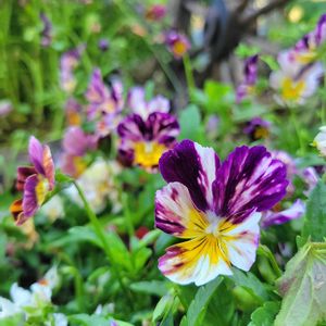 落ち葉のような色合いのビオラを見つけました🍁 ブラッシュストロークと言うのだそうです🍁 モザイク模様が珍しくて手に取りましたが、昨年も青色のモザイクを迎えたのでした、、‼️私の中でモザイク柄のビオラは気になる模様のようです😊 白いデイジーと✨