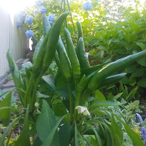 🌶️ 「激辛」という品種のトウガラシ。 こんなにおっきーんです😆 数本青唐辛子で収穫して、輪切りにして冷凍します🎵 冷しゃぶとかラーメンとかのトッピング用です😉