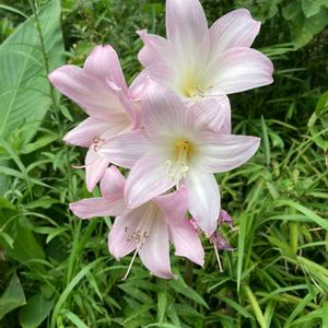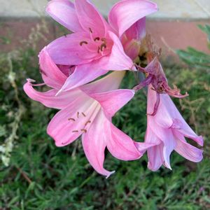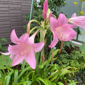 散歩の途中🚶♂️ 住宅の道路脇 秋咲き品種のアマリリスでしょうか? 💕本アマリリス💕 別名: ベラドンナリリー、アマリリスベラドンナ ヒガンバナ科 本アマリリス属 ピンクの芳香のある花。🌸 原産地: 南アフリカ 初夏に葉が枯れたのち、夏の間は休眠します。
