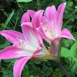 昨年9/20に投稿してホンアマリリスと教えて頂きました🙇 花の咲くこの時期には葉が有りません✨ これは8/27に撮ったものですが今朝通りかかった時はピンクが少し濃くなっていました🎶 長く楽しめる様です❤️ <ホンアマリリス> ヒガンバナ科ホンアマリリス属 別名 ベラドンナリリー