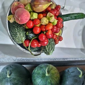 午後から畑へ。イチジクが色づいたので収穫。これから毎日見ないと。桃、トマト、イチジク、食用ホウズキ、トマト。冬からあるソラナムパンクキン、マリゴールドは元気だね~