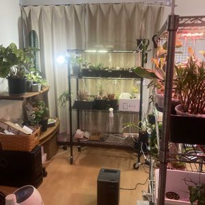 まだまだ余裕がある✌️ 今年、棚を買い足してよかったー 昔使ってたPCデスクもフル稼働させてます😂 サーキュレーターはメインが床置き、棚に小さいのを2個設置、加湿機も回してますー 先日、窓に防寒と結露防止対策のシートを買って窓に貼りましたが、今朝の植物部屋は9℃でした😨 ビニールのカーテンみたいなの、買おうかなぁ… もうカラジウムが、芋だけになりそうですw