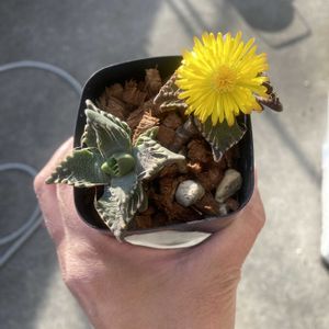 咲いたー🌼 かわいい! ガオガオちゃんなのに、お花はタンポポみたい😍 3年経つけど株は全く増えないけど、これでも大きくなってるんです🤭