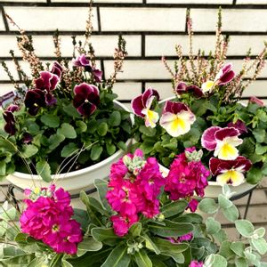 パンジーわらくがだいぶ咲いてきて華やかになってきた😆💕 いわゆるABBCCの寄せ植え。主役Aのストックは198円だったような、、この子もだいぶモリモリしてきてうれしいな❣️😆