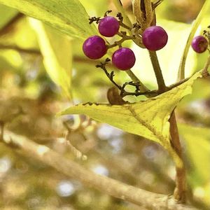 🍀ムラサキシキブ/紫式部 🏷️今日のお花 花言葉・「聡明」「上品」「愛され上手」 コムラサキと同じです! ○枝は横か上に伸びる ○実は枝にまばらに付く ○葉のギザギザは全体に ○花は葉と同じ場所に咲く ムラサキシキブの近縁に昨日の「今日のお花」コムラサキがあり園芸店でムラサキシキブと販売されているものはコムラサキの方が多いとか。 公園などの公共スペースの植栽で見られるのものもほとんどがコムラサキのようです。 ①去年 森林植物園にて 名札付きでした ②③わが家のムラサキシキブ 園芸店ではムラサキシキブと記載 実の付き方がマバラ 枝も横や上に伸びてる 等当てはまるので多分ムラサキシキブ・・かな😆 ④シロシキブ (シロミノコムラサキ)こちらはコムラサキですね お出かけ先にて