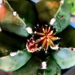 1属1種…大好きな響き✴️😆 淡いグリーンとグレーの融合 微妙な肌合いが 独特な唯一無二な子 ブラックな棘とのコントラストが好き😘🥹 高山性のサボ君は蒸し暑い夏が大嫌い💦 カラッと湿度の低い 肌寒い今の季節が よほど嬉しいのか 紅い棘を出し始めた 棘座まで紅い箇所も💦 新棘は白いと聞いていたが この子は亜種なの?🤔 本体株元が赤サビ色になる 特異な性質による変色? 判らないことだらけ🥹
