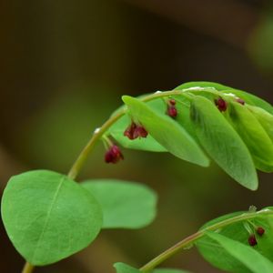 コバンノキ(小判の木) コミカンソウ科コミカンソウ属 落葉低木 赤紫色の花が雄花です。葉の蔭に咲くのであまり目立たないです。雌雄同株ですが雌花は写っていません。 葉は長さ3センチ程の卵形で小判に見えることから「小判の木」と呼ばれます。