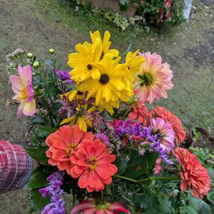 おはようございます。 あのあり得ない小さい種からのお花です。 ジフィーセブンに、種まきしたものの、要領が、わからず、半分以上ダメにしましたが、どうにかジニア、マリーゴールドも、生育中。 イベントで買った、少しお高い種でした。 コレオプシスは、ステキなカラーで、咲き始めました。 ルドベキア、しつこく投稿、やっと、八重の花が咲いてきました。 去年の、ブロンズ色のは、消えてしまった。 今日はお墓参りです。 アジサイ、デージー、ホタルブクロ、銅葉ダリア、入れてみました。 外に出ると、虫が集まってきます。 楽しみな、アンジェリカギガス、虫が多すぎる。 ネットで調べたら、やはり多いらしい。 でもお花は、見たいな。