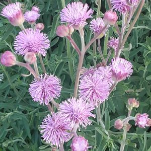 香りアザミ プレーリーマスコット (モモイロハナビ) 南アフリカ原産で、けっこう繁殖力あり、冬は枯れるのに、この房咲きのピンクの花が枯れるとタンポポみたいに飛んで行き、翌年思わないとこからヒョッコリ💗