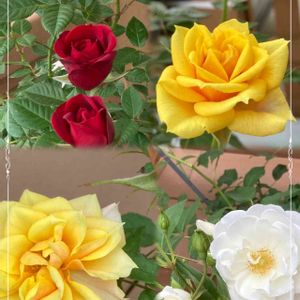 今日咲いた薔薇たち 雨の予報が薄陽のさす天気で薔薇の雨除けに掛けたシートを取りました。 ウッドデッキは今薔薇の香りに包まれています🌹
