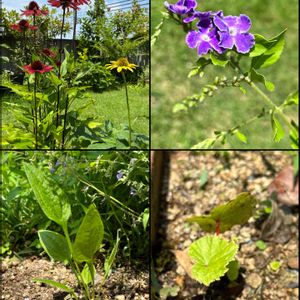 2枚目です(⋆ᴗ͈ˬᴗ͈)”ペコ ↖️ エキナセアがエキナセアらしくなってきました❁⃘*.゚ 頑張れ、イエロー*(°̀ᗝ°́)و💛 ↗️ お天気がイマイチで 3日程 庭の事をサボっていたら いつの間にかデュランタさんが咲いていました💜✨ 挿し木っ子の2年目さんです(*^^*) ↙️↘️ 今日、サボっていた草引きをしました。 昨年 エキナセアを植えていた場所から、エキナセアっぽい葉が出てきていました🌱.*゜︎︎こぼれ種かな…♡.*゜ 秋海棠の葉も…🌱.*゜︎︎ 草引きしないと 気付かなかったので、 ご褒美という事で…(*´艸`*)♡
