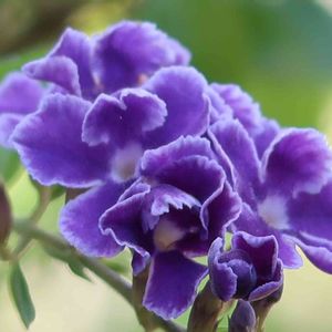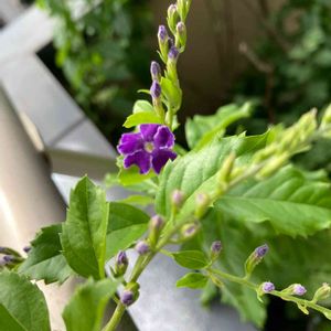 去年9月🪴初めてお迎えした鉢物 見切り品だったので咲き終わりの 数輪しか見られなかった😔 (1輪だけの…10/5投稿) 室内の廊下とはいえ、外気と変わらない あの寒い冬を越え、枯れ枯れになり… 春🌷🐝… ダメもとで外に出したら葉が繁り🌿 鉢を大きくしたら花が咲きました٩(ˊᗜˋ*)وʸᵉᵃʰ♪ 💜デュランタ💜宝塚 パープルラブ💜 白の縁取りが可憐です✨ まさにパープルラブ💜たまらんです♡ ❁。.:*・゚(∩´︶`∩)゚・*:.。❁