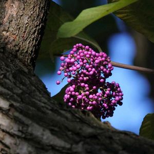 今日のお花 コムラサキ オオムラサキでしょうか 隣の駅の植栽 大きな樹の隙間から見上げると 青空にぽっかり (手前の樹は違います) 大きなこの樹の紫色の実を見るのは 秋のお楽しみ