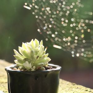 朝露をまとう蜘蛛の巣✨ 盆栽鉢の斑入りプロリフィカも朝は過ごしやすそう😊