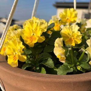 朝日を浴びるミルフル☀️…あぁ可愛い😆 2️⃣全体像 お花が恋し過ぎるので、寝室(兼、仕事部屋)のベランダにビオラを吊るしてみました🫶 陽当たりが良いので環境的にも良いです🙆♀️ 株元が良く見えて花殻摘みも し易くなりました😉