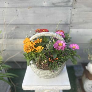 鳥ちゃん付きのバスケット🕊️ 八重のジニアが可愛いすぎる💕