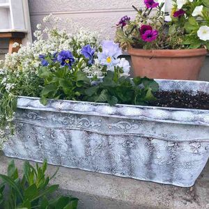 プラスチックのプランターにセメントをまぶしてペイントしリメイクしてみました。 絵になるスミレのパルムとマリーヌを中心に、ムスカリ、アネモネ、ヒヤシンスなど青い花の球根を植えてみました。